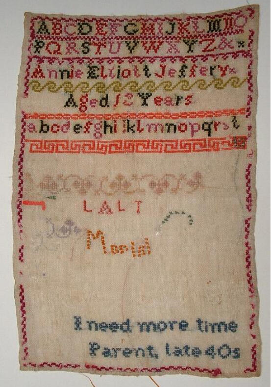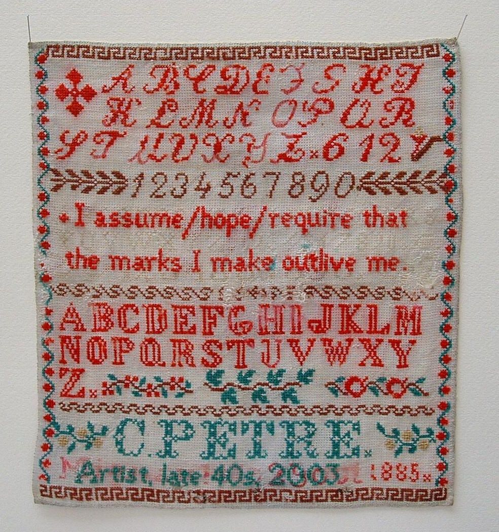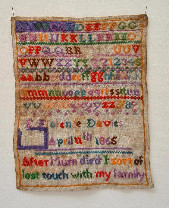 2013 - Subversive Design, Brighton MuseumThe work for this touring exhibition comprised a number of nineteenth century child-made samplers which were altered by unpicking parts of the original text and images and replacing them with my own. The texts of sentimental received truths were replaced with new texts reflecting adult and parental fears and doubts at the beginning of the twenty-first century.Responses to the work, alongside its potential for exploring concepts such as violation, dialogue across time, the continuous process of art as a conversation, led me to continue working in the medium. Further exhibitions of this kind of work included 'Home' at Contemporary Applied Art 2015, Subversive Design' at Brighton Museum & Art Gallery 2013, 'Art in Romney Marsh' 2012, 'Unravelling Nymans' 2012.Several issues are raised by this body of work, not the least of which is the physical intervention by a male artist in work made by young women. There are also questions of whether the work itself invites further intervention, how it changes folk art into fine art, and whether destruction and creative activity can be reconciled.