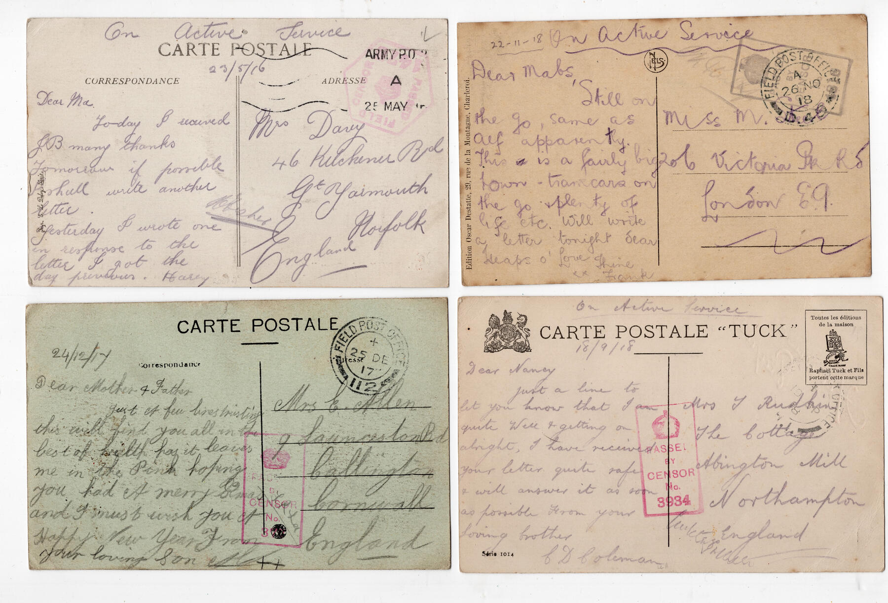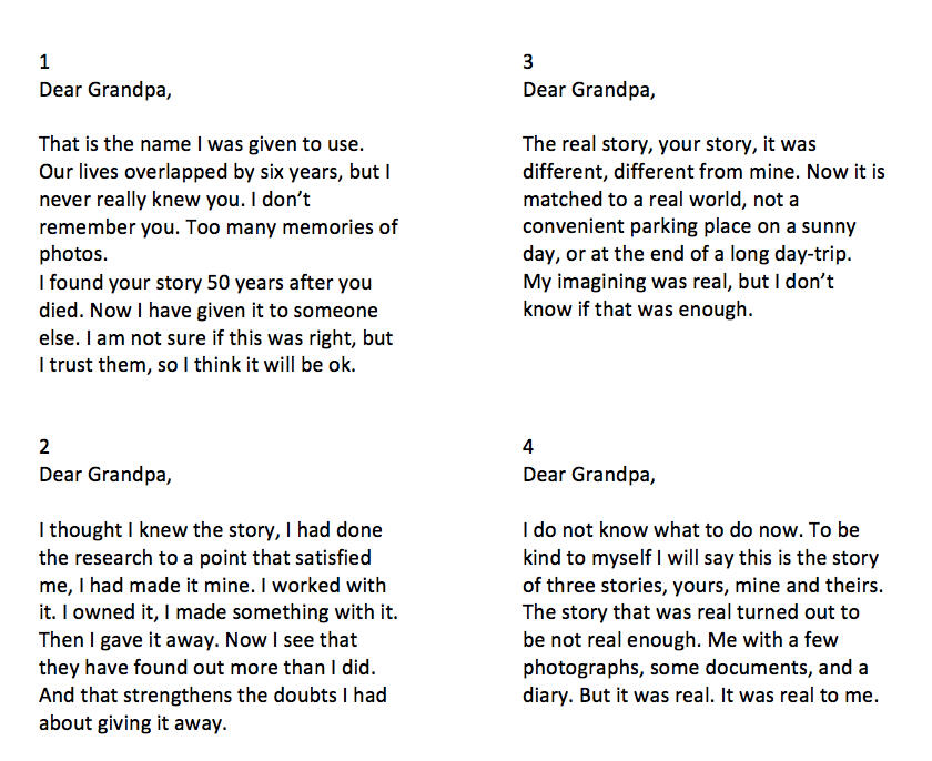 Four postcards written home by soldiers during the First World War, text erased and rewritten.The deliberate destruction of historical material in Four Postcards to my Grandfather suppresses the archival drive in favour of direct communication with the past. Archives destroy memory. Here the sharing of the archive within the context of an unremembered relationship raises issues of privacy, failure and ownership.One of the works made for Borderlines, Front Lines (ISELP, Brussels, 2023) was part of a collaborative work in which family archive material and memory was shared with Philippe Black and Sam Vanoverschelde. It comprises four altered postcards. The postcards were written and sent to addresses in England between 1916 and 1918 by British soldiers on active service in France or Flanders during the First World War. On each one the correspondence section has been almost completely erased, and written over with my own text, four messages to my grandfather, who also served in these areas between 1916 and 1918.As the destruction of historical material sometimes excites comment and protest it is useful to discuss certain points, and to consider some implications.The destruction of cultural material as an act of creative art is not new. Robert Rauschenberg’s Erased De Kooning Drawing was made before I was born. The artwork is both the act of erasure and the erased drawing as evidence of the act. For hundreds of years previously cultural artefacts have been made by consciously recycling, reworking, overpainting, and incorporating other older cultural artefacts.I have been using this process, partial erasing of historical cultural material, with the addition of my own work, for over 20 years, using a range of media.Each postcard was selected for not being special; in each case part of its value lies in its lack of differentiating features, its similarity to so many hundreds of thousands of other postcards, referencing a huge commonality of experience. Each one is also an individual experience.People have in the past asked with regard to my working in this way, how I would feel about my own work being erased. This is one reason why I have written the text in pencil. It is both a reference to the original medium used, an acknowledgement that the point is valid, and laying the work open to future intervention.Every one of these postcards has lost contact with the family concerned. In each case the card would have been easily traceable by a researcher, and was sold via a well-known internet marketplace. Of the four soldiers who sent the cards, two may have been killed in action after the cards were sent, and two survived the war.For archival purposes a record both of the original text, and of my erasing it, was kept. To be erased at the end of the exhibition.And, since this work stems from the First World War, a phrase from that conflict is relevant. Amongst the heavy-industrialisation of death cynicism flourished, truth pared of all presentation; in order to get the soldiers out of the trench to face a heightened risk of death one officer was heard to encourage them with the words ‘Come on, do you want to live for ever?’