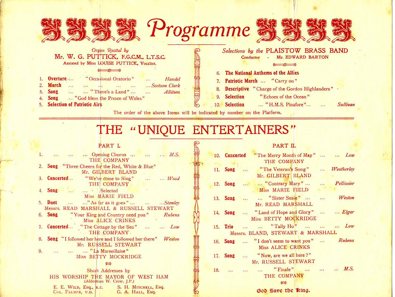 At the start of the First World War German armies invaded Belgium, causing a massive movement of refugees, about a quarter of a million of them being given refuge in Britain. From November 1914 to 1918 up to 67 refugees, mostly the families of postal workers, were given shelter in Valentines Mansion, Ilford. At first they were welcomed enthusiastically, and for many people this was an opportunity to patriotically support a country which came to be known as 'plucky little Belgium', even though some were aware of the institutionalised violence which had characterised the Belgian colonial exploitation of the Congo.Fundraising was carried out diligently over 1914 and 1915; concerts, whist-drives, social evenings, collections and flag-days all brought in food, clothing and money for the refugees. At one concert, in October 1914, in Stratford Town Hall, my grandfather, Fred Walker, under his stage-name of Russell Stewart, sang four comic songs.By late 1915 the funding had become institutionalised, and some were questioning the costs of fuel and support, and whether the refugees were doing enough to support themselves. By 1916 discrepancies over Belgian and British conscription, and the fear that Belgians were 'taking British jobs' were making people view the refugees less favourably, though by this time too the British government was secretly recruiting Belgian industrial workers in Holland to come and train British munitions workers. Thus in a sense Belgians were working to make the shells which were destroying their own land. While using Belgian support the British government was careful to keep track of the Belgian refugees so that they could be repatriated - 50,000 history cards are still kept at the National Archives, and have provided some of the names of the Valentines Belgians.By late 1917 most of the Belgians at Valentines had moved on, to find accommodation elsewhere, and the house was being turned into a maternity hospital.But following the German offensive in early 1918 more hospital space was required for British soldiers and there were plans to turn Valentines Mansion into a convalescent home. Views were expressed however, that this might be interpreted as 'throwing the Belgians out.'In 1918 my grandfather was stationed in a trench 100 metres from the Belgian border. His diary for Weds 9th Oct reads 'Gassed'; for Sun 13th Oct 'Began to see a little'; for Mon 11th Nov 'Armistice signed with Germany'.In 1920 the War Refugees Committee for Ilford petitioned the Council for permission to erect a brass plate in the Mansion stating that Belgian refugees had been housed there.The familiar stories of welcome, charity fatigue, generosity, bureaucratic control, and self-congratulation underlie this largely forgotten story of refugee migration, in an area whose identity is formed of migrating people. In workshops with clients of the Refugee and Migrant Forum for East London, local research enthusiasts, and staff and volunteers at Valentines Mansion, we are working through the story from different angles, and producing artwork which uses such elements as First World War postcards, soil from Belgian battlefields, fragments of wallpaper and rescued laths from the walls of Valentines Mansion, Congolese postage stamps, a newspaper advertisement offering free haircuts to Belgian refugees (not Saturdays), songs from the 1914 Stratford concert, and texts from Government memoranda.A key work is a video in which I sing the four songs my grandfather sang in the 1914 concert. The songs are performed solo in a field near where he was wounded in 1918.