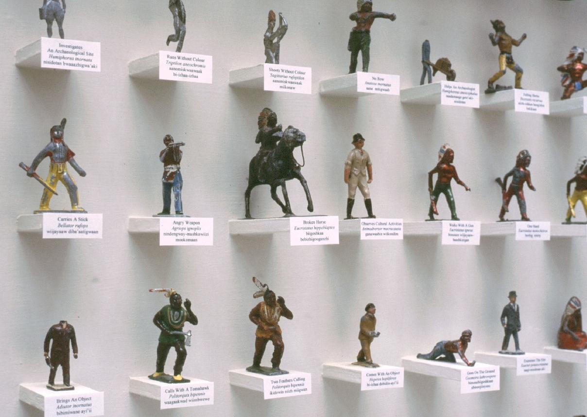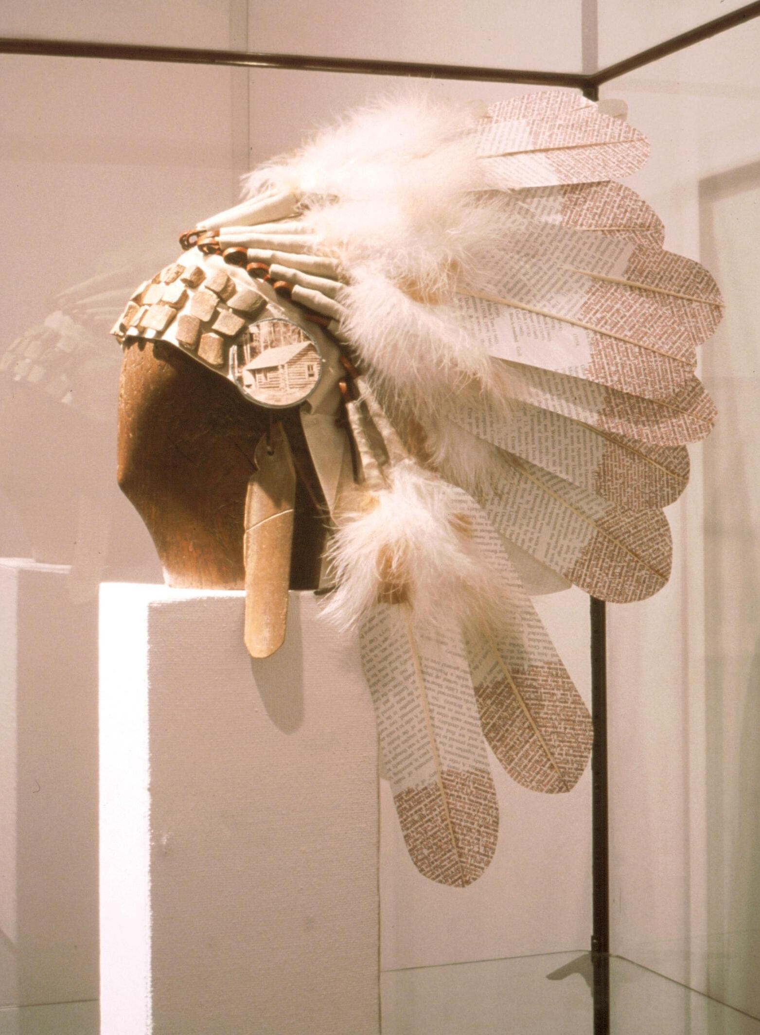 Hastings Museum & Art GalleryThis exhibition developed my fascination with the power of objects and the notions of reality, authenticity and truth attaching to them. Working with the three histories of Grey Owl, Piltdown Man, and the Hastings Rarities, the works knit a tissue of lies, denunciations, corroborations, probabilities and possibilities, in which constructed objects and the language in which they are presented create a new, and at times uncanny, reality. Focussing on particular aspects of the stories, such as hierarchies of cultures, the need to belong, and the role of text in falsehood and denunciation, the works move, like the protagonists of the histories, along apparently reasonable lines of argument to arrive at conclusions which are simultaneously desirable and uncomfortable.Archie Belaney, born in 1888 in Hastings, was brought up by two aunts and emigrated to Canada, drawn by his fixation with Native American culture. Some time in the 1920s he changed from being a fur-trapper on the fringes of Indian culture, to being a beaver conservationist and writer of articles on wilderness ecology. Encouraged and eager to move to within Indian culture to promote his local lecture series to rich holidaying whites, and already being a good speaker of Ojibwe, he re-invented himself as WaShaQuonAsin, He Who Walks By Night, or Grey Owl, at first the product of Apache/Scot parents, and finally as a full blooded Ojibwe chief. His lecture tours took him to the UK, where he spoke on radio, in lecture halls and cinemas, before royalty, and ultimately led him to Hastings, where he was recognised. The accusations of fraud, together with alcoholism, led to his death in 1938. He wrote a number of books, which are precursors of popular scientific ecology writing, and made a few short films about his life with beavers; he is currently regarded as an important founder of conservation in Canadian Parks, but probably more as an interesting identity-shifter/imposter.Piltdown Man, excavated near Uckfield in Sussex between 1911 and 1915, was unmasked as a forgery in 1953 as a result of the early use of flourine dating. The components of the skull were found to be parts of a C14 woman, and the stained canine tooth of an orang utan. The chief protagonists were Arthur Smith Woodward of the Natural History Museum, who wrote a book about the discovery entitled The Earliest Englishman (sic); Sir Arthur Keith, anatomist at the Royal College of Surgeons; and Charles Dawson, a local solicitor and antiquarian who is credited with a number of honest discoveries, and a number of hoaxes, many of which were donated to help found the Hastings Museum. All have been accused of initiating the forgery, and all are now looked on with disdain.The Hastings Rarities were a group of birds shot in the Hastings area between 1892 and 1930, mostly stuffed by local taxidermist, George Bristow, some of which found their way into Hastings Museum. Following re-examination of their documentation in 1962, a large number were declared to be fraudulent visitors and were unceremoniously removed from the List of British Birds. Some of the specimens at Hastings were found to have museum-bug and were burnt. One theory is that the alleged perpetrators, never named, were thought to have had the birds shot in Eastern Europe and shipped on ice in order to be sold at vast profit to local collectors; the recorded prices, and common sense (some of this was supposed to have happened in wartime) do not quite bear this out.The works comprise a video performance based on the desire to belong, in which the artist travels from his home to the museum costumed successively as a American Indian (the term preferred by an Ojibwe consultant), a bird and Piltdown Man; a vast collection of objects which turn Piltdown into a site of continuous and important archaeological habitation, and a number of hybrid objects creating pockets of truth within a framework of lies. These last include a neolithic taxidermy kit, an American Indian headdress made of text and bones, and a case of lead-toy archaeologists and American Indians zoologically named and labelled in English, Latin and Ojibwe.