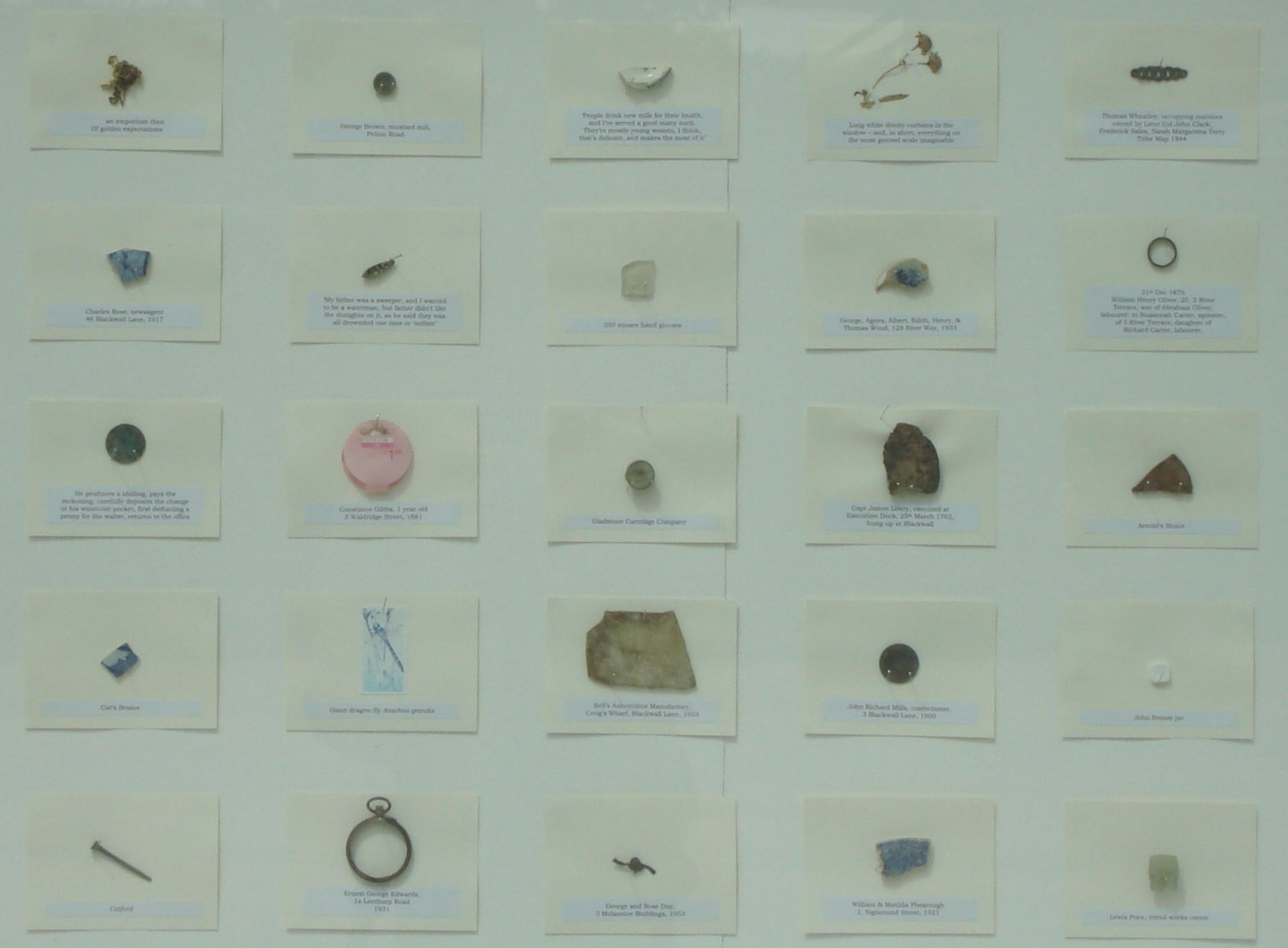 The Greenwich Peninsula is an area that has undergone repeated change over the past 500 years, and yet remains one of the least known parts of London. Though many Londoners know well the Blackwall Tunnel Approach Road, and hundreds of thousands of visitors go between North Greenwich Station and The O2, few walk the area between the south and north of the peninsula, with its mixture of luxury apartments, Victorian terraces, thriving chemical factories, retail parks, shadows of London’s industrial past, and unexpected open spaces.Like so many better known parts, the peninsula has acted as a stage on which the roles of London have been performed. The drama can be read in a number of ways: as land use – marshy wilderness, agricultural, industrial, cheap housing, dock services; as the products of and for the city at the centre of empire - soap, cement, sugar, chemicals, linoleum, ammunition, cabling, gas, boats, tar, paint, benzene; in the occupations of its inhabitants – market-gardeners, scavengers, industrialists, laundresses, shopkeepers, lightermen, munitions workers; and in how their lives were recorded – in census, parish and workhouse records, in maps of tithes, bomb damage or relative social status, in newspapers and the writings of Mayhew, Dickens, Gissing and others.Looking at the history and the present of the place, famously described by Iain Sinclair as “where the nightstuff was handled”, there is no sense of a “coherent proper state” or any form in which the place has achieved its most appropriate condition. How then do we invent an identity for the area?Births, Chimneys and Lightermen – Collecting Greenwich Peninsula has been commissioned as an installation for the Story Wall between North Greenwich Station and The O2, which explores how we negotiate a sense of place. Using research findings which include aspects of demographics, geology, archaeology and natural history, the work is a vast grid collection of artefacts, objects, printed and drawn fragments and information, in which connections between object and text may be authentic, viable, fictional, imagined or arbitrary. The work invites viewers to create their own stories, which allow for continuous reinvention.In Doreen Massey’s words, “the throwntogetherness of place demands negotiation ... places as presented here in a sense necessitate invention; they pose a challenge. They implicate us ... in the lives of human others, and in our relations with nonhumans they ask how we shall respond to our temporary meeting-up with these particular rocks and stones and trees. They require that, in one way or another, we confront the challenge of the negotiation of multiplicity.”*; the work acts as a catalyst for that negotiation.This work continued collection-based installations shown over the previous 12 years in the UK and abroad, many of which have involved local residents.The art installation was commissioned by Art in the Public Realm Greenwich Peninsula, a consortium comprising: Arts Council England, Meridian Delta Ltd (Lend Lease and Quintain), English Partnerships, Greenwich Council and Greenwich Millennium Village Limited, working in collaboration with O2 / AEG* Doreen Massey For Space Sage 2006The work was on display from early February till late September 2008