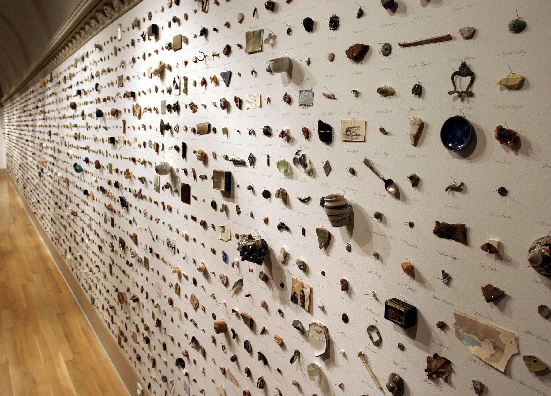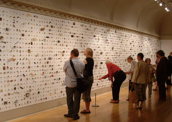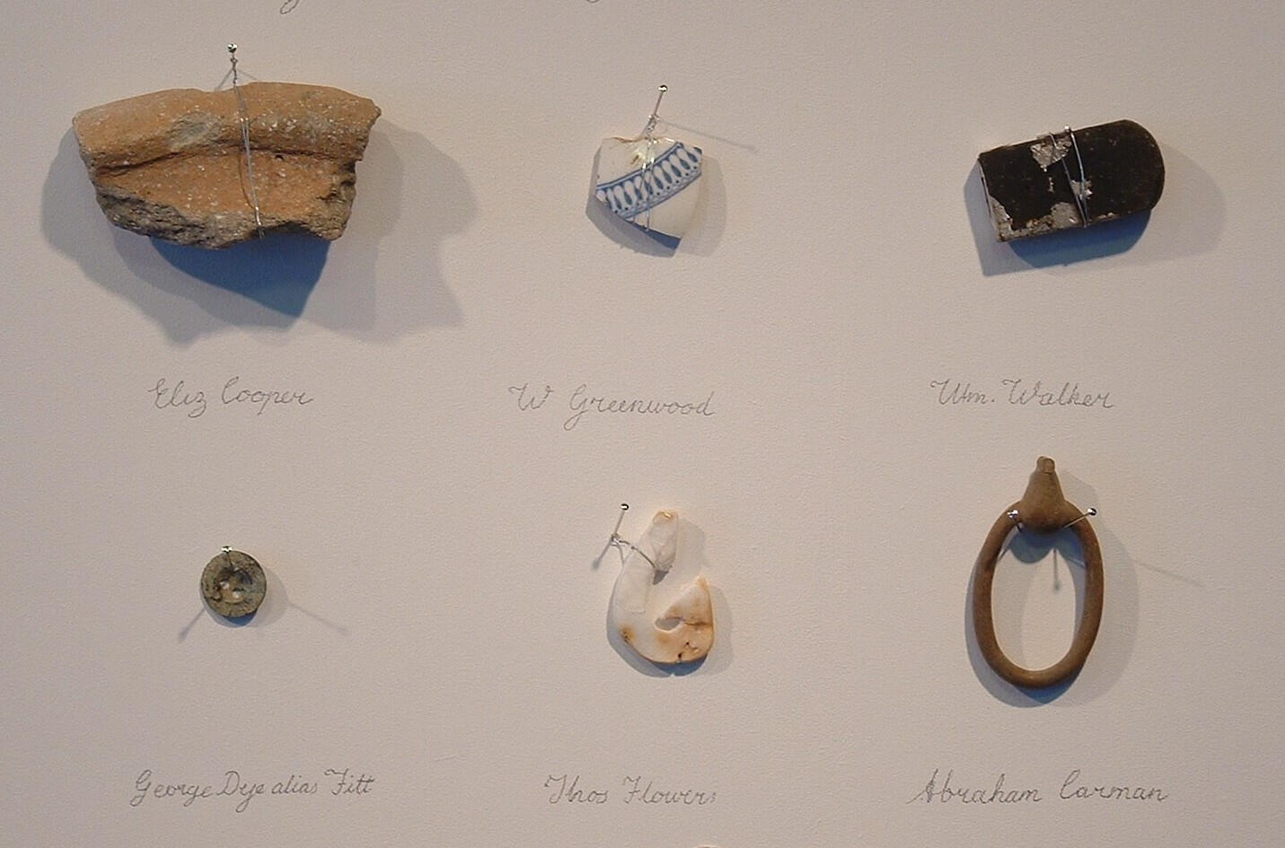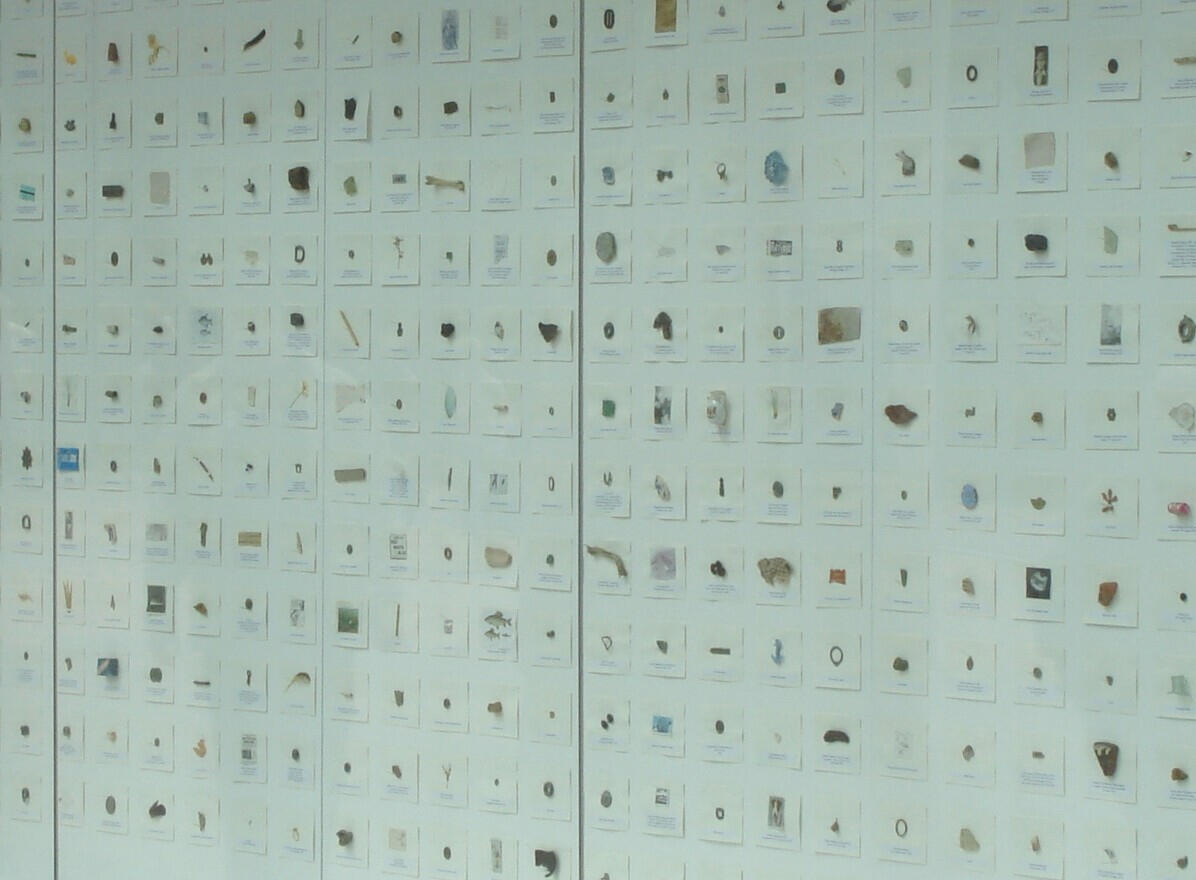 20 x 2.4 metresNorwich Castle, for most of its long history, was primarily a prison. Only towards the end of the nineteenth century did it become a museum, the cell-blocks and exercise yards which radiated from the central guard area becoming galleries to display art, historical artefacts, taxidermy specimens, rocks, fossils and examples of applied arts.The familiar opposition between what I know and what I see is central to my experience of this site, the "what I see" being the museum, and the "what I know" being the much longer history of the site as a prison. Is it possible to bring together simultaneously these two identities, to know together the two times of the one place ? What happens in the changing of the place from a site of misery to a site of treasuring: does the melancholy linger? Do the boredom, the fear, the repetitive tasks become museum objects? Was there inherent in the prison a sense of items extra-ordinary, different, and curious?This work comprised over 4000 objects in a grid on the wall of the Timothy Gurney Gallery at Norwich Castle Museum. Each item was labelled with the hand-written name of someone who at one time was held on the site as a prisoner. The items were in a sense all failures of the museum test: they were broken, torn, bent, corroded, dirty, burned; fragments or fragmented; the commonplace, the not very interesting, the cheap version; copies, forgeries, pastiches; covers, mounts, labels. Never the real thing, or if they were, then there only by a mistake of judgement.And the identities were those of people who spent time imprisoned here for crimes ranging from rape, murder and rebellion to the theft of a smock, a turkey or a loaf of bread, or simply for following the wrong faith. Some were executed, some were repeat offenders, and some were no doubt entirely innocent. Their crimes, like their names, were peculiar to them, but become repetitive, expected, almost as inevitable as the stuffed birds, the landscape watercolours, the fossils and the Roman coins. Some indeed stand out; the murderer, the polar bear, the hero’s hat, the transportee turned successful businessman, the leader of the rebellion, the prison Bible, the painting of the bridge. Mostly they pass before our eyes, a succession of objects, names, dates, statements, inviting occasional scrutiny; the object so like one I have at home, the name so like my own.Objects and identities are linked here by the fact that they were put in a safe place removed from circulation, through the well-intentioned offices of an authority working for the improvement of society.I suspect that the work is mostly about time, or times. An anagram of "items".Perhaps the most poignant aspect of the work came when it was being erased. Something I was told later. Two people who repaired the wall after the objects were removed - only the objects, not the names - came across two names they recognised as long-dead family members. I was told that they cleaned the wall of names, except for these two, who they left alone for a while, before also removing them from the record.